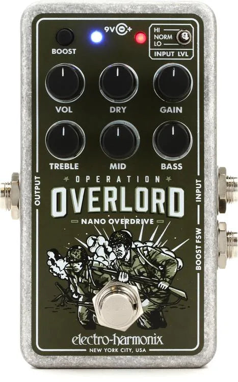 A nano-sized version of the Operation Overlord with the same great overdrive and distortion tones, but in mono for those who don’t require stereo ins/outs. It’s super versatile and ready for your axe be it guitar, bass or keys.